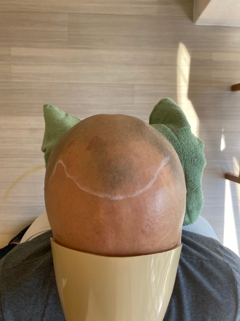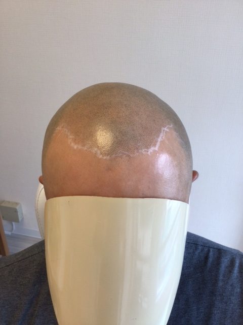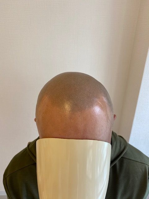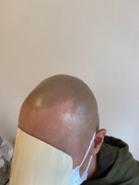 今回の例は自毛が濃い方なので、スキンヘッドの割には、仕上がりが少し濃く見えると思いますが、クライアント様と相談した上での色味なので、喜んでいただきました。